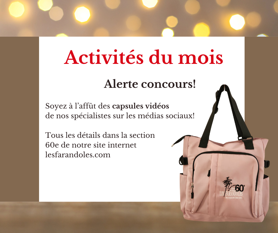 Tout au long du mois de janvier des capsules chorégraphiques seront publiés via nos réseaux sociaux pour apprendre un enchainement jazz à la maison. Nous vous invitons à vous filmer et à nous faire parvenir votre vidéo de l’enchainement chorégraphique par courriel à administration@lesfarandoles.com ou encore via nos réseaux sociaux pour courir la chance de gagner un magnifique sac fourre-tout des Farandoles.